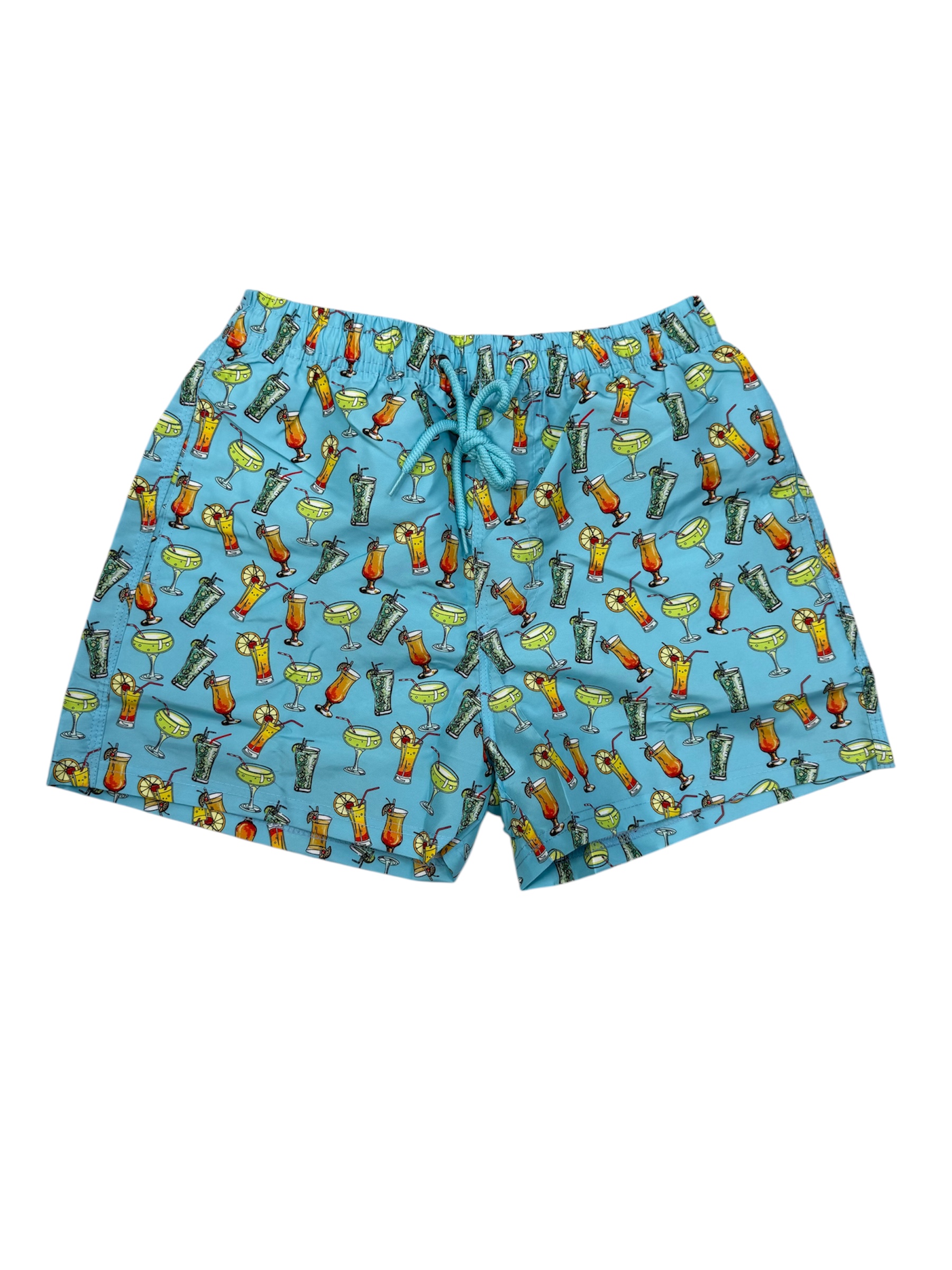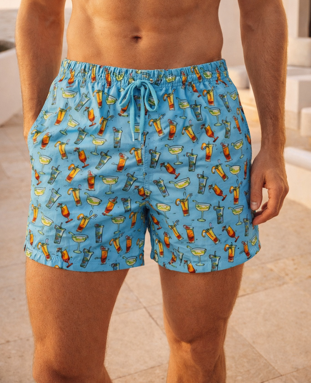 Мъжки бански шорти. Моделът е декориран с ефектен цветен принт на коктейли, който създава усещане за лятна ваканция, море и екзотика. Изработен от лека и бързосъхнеща материя, банският осигурява комфорт както на плажа, така и край басейна. Моделът е с удобна еластична талия и регулируема връзка за перфектно прилягане. С вътрешен мрежест бандаж. Моделът е с два странични и един заден джоб.