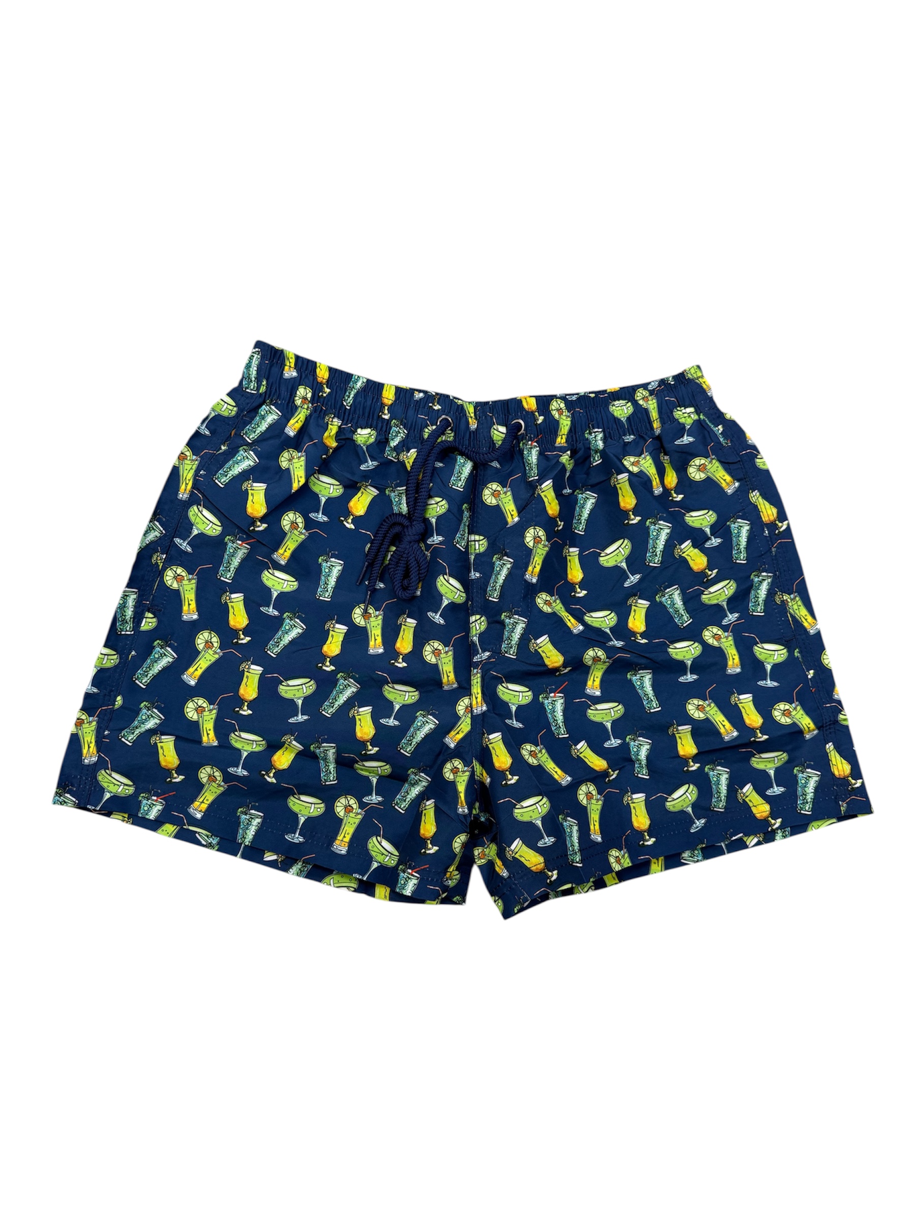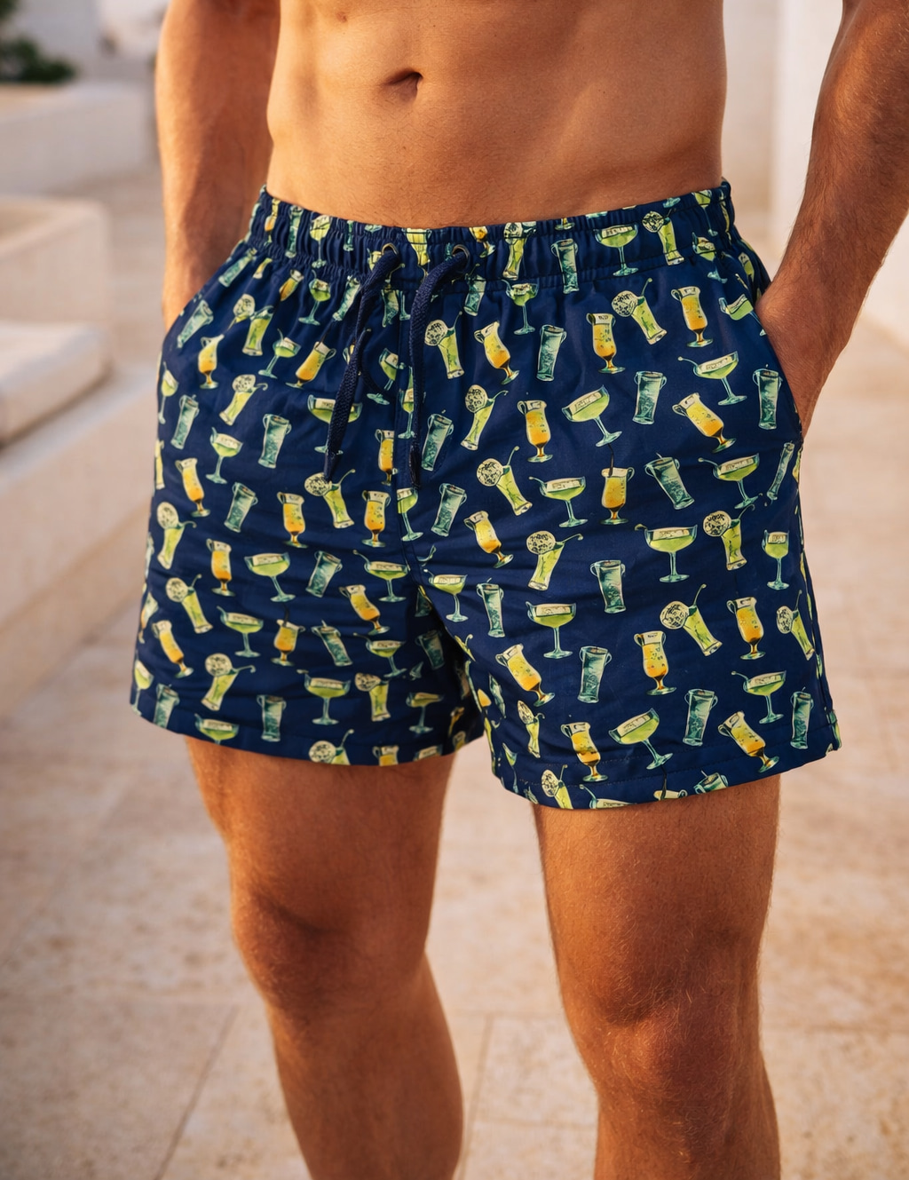 Мъжки бански шорти. Моделът е декориран с ефектен цветен принт на коктейли, който създава усещане за лятна ваканция, море и екзотика. Изработен от лека и бързосъхнеща материя, банският осигурява комфорт както на плажа, така и край басейна. Моделът е с удобна еластична талия и регулируема връзка за перфектно прилягане. С вътрешен мрежест бандаж. Моделът е с два странични и един заден джоб.