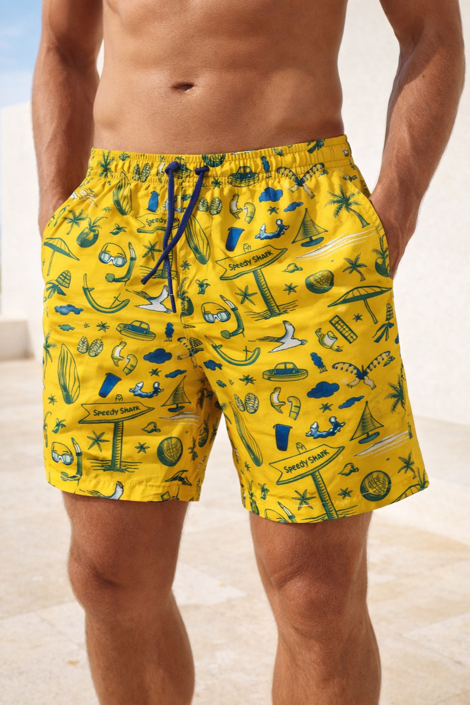 Мъжки бански шорти. Моделът е с удобна еластична талия и регулируема връзка за перфектно прилягане. Изработени от лека, бързосъхнеща материя, с вътрешен мрежест бандаж. Моделът е с два странични и един заден джоб.