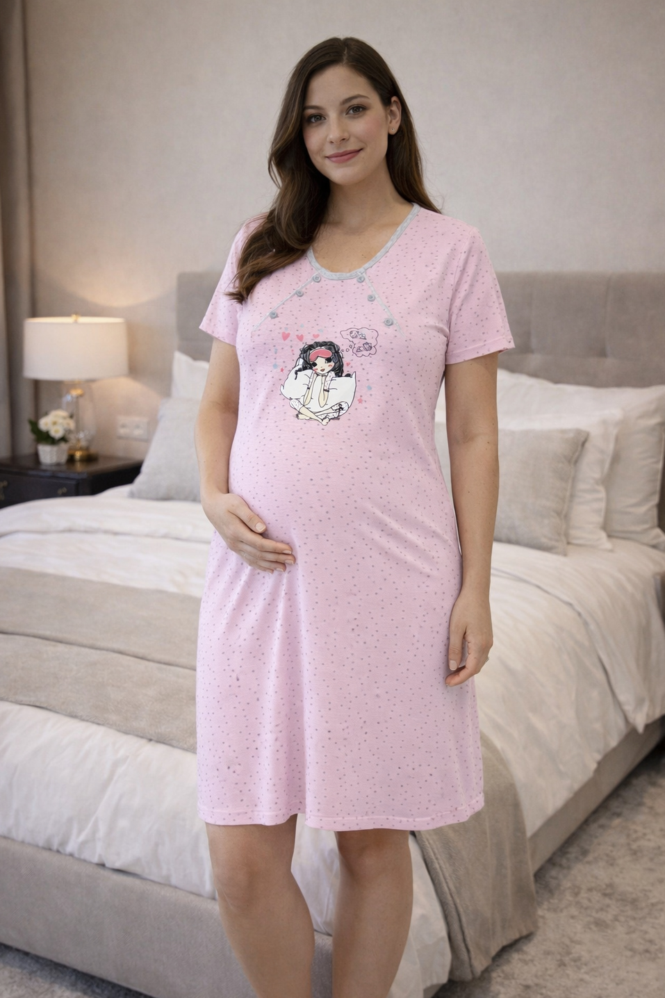 Бюджетна нощница за бременни и кърмачки. Комфортна и стилна нощница, специално създадена за бъдещи и нови майки. Изработена от 100% мек и дишащ памук, тя осигурява нежно усещане върху кожата и оптимален комфорт по време на сън и почивка. Свободната кройка и еластичната материя се адаптират към променящото се тяло по време на бременността и след раждане. Практичен дизайн с копчета в предната част, които улесняват кърменето и прави модела удобен както за дома, така и за родилното отделение.