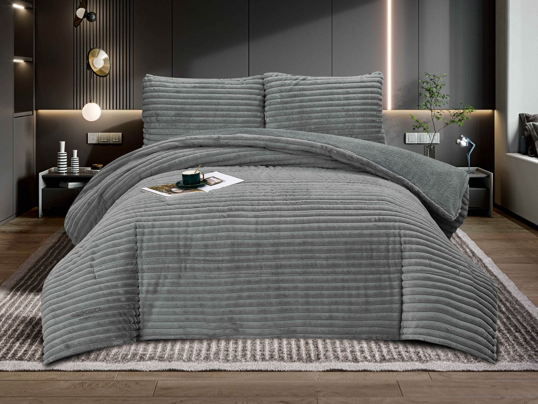 Комплект пухена завивка с 2 калъфки в тъмно сив цвят – мека, топла и стилна, идеална за уют и комфорт през студените месеци.