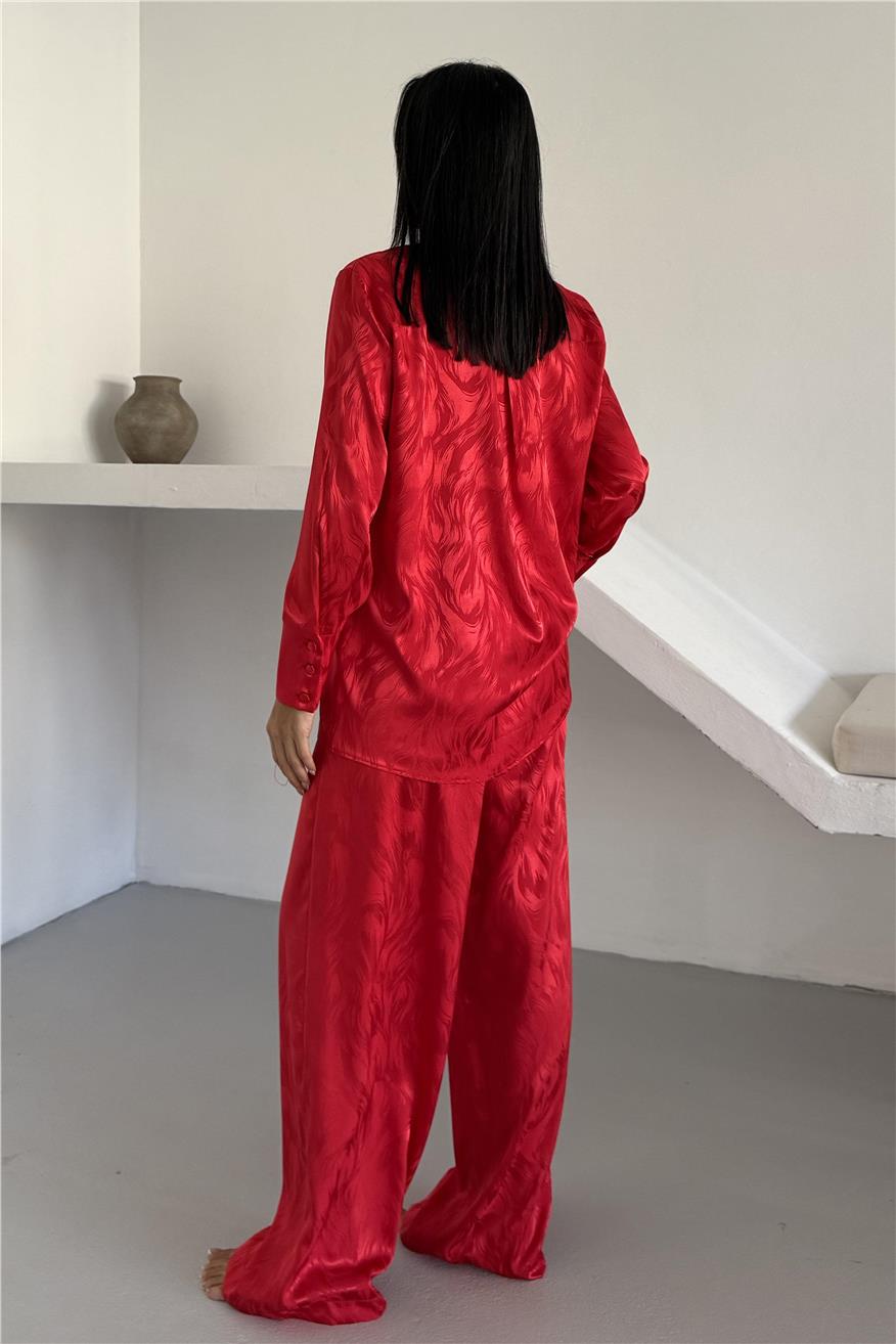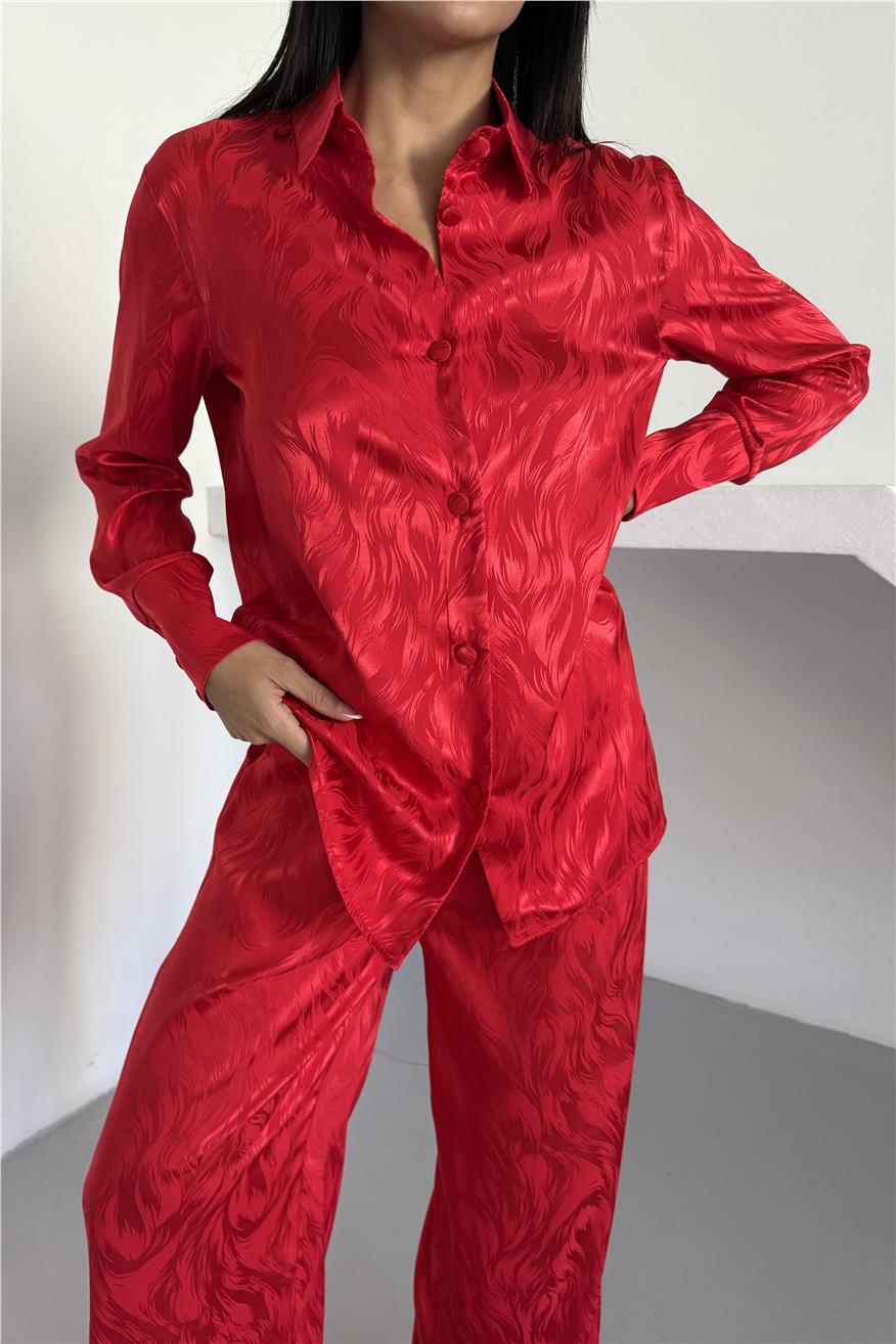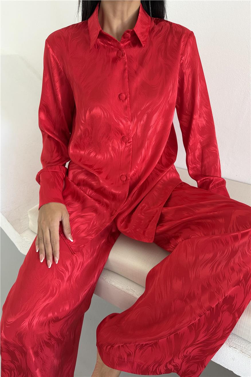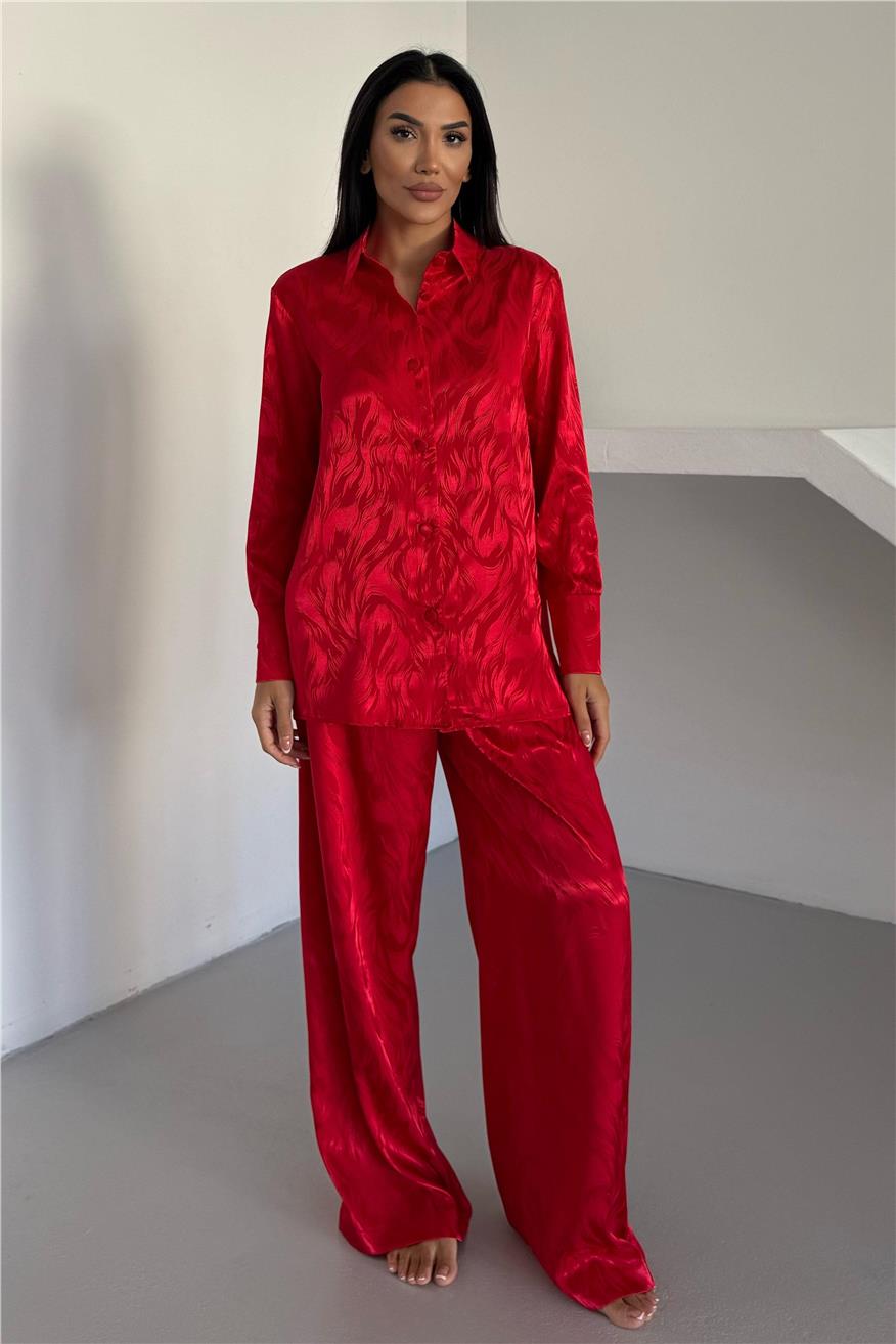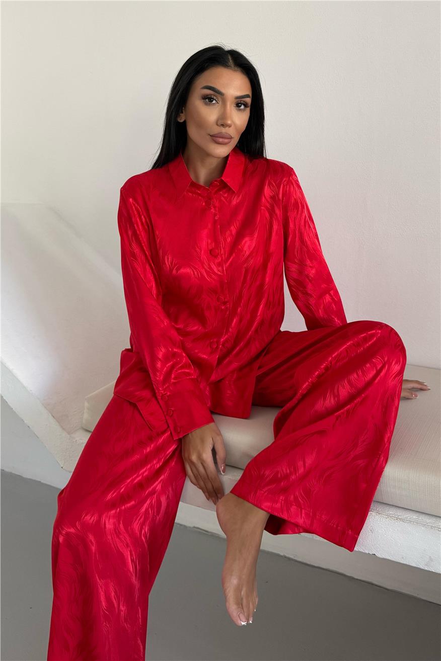 Елегантен сатенен комплект жакард от две части. Комплекта включва дълга риза с копчета и широк панталон с джобове. Този сатенен сет е идеален избор както за домашен уют, така и за стилен подарък. Материята е мека, нежна към кожата и придава усещане за лукс.