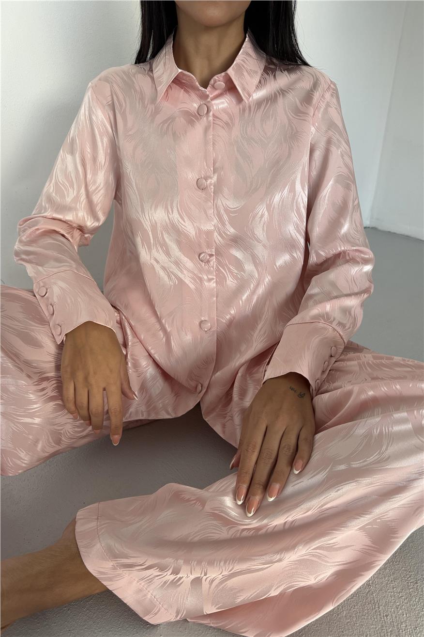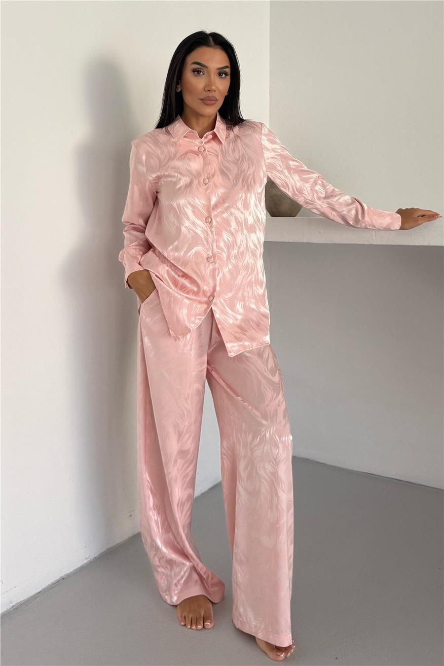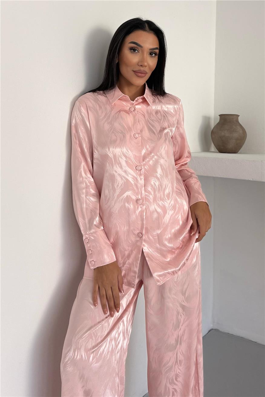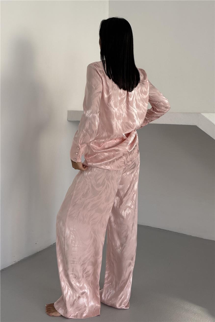 Елегантен сатенен комплект жакард от две части. Комплекта включва дълга риза с копчета и широк панталон с джобове. Този сатенен сет е идеален избор както за домашен уют, така и за стилен подарък. Материята е мека, нежна към кожата и придава усещане за лукс.