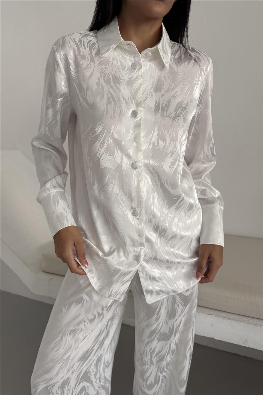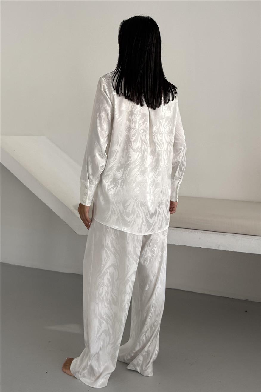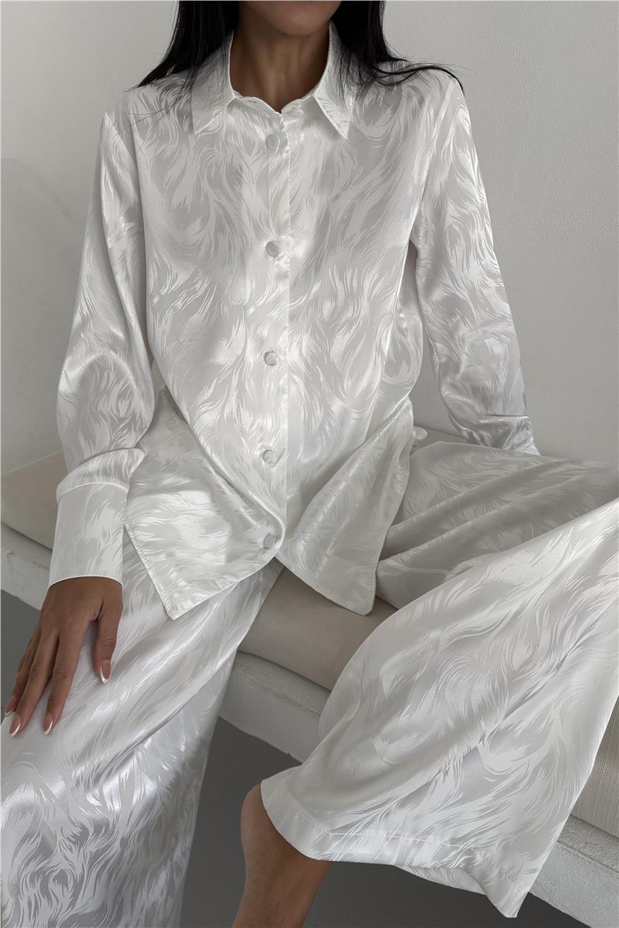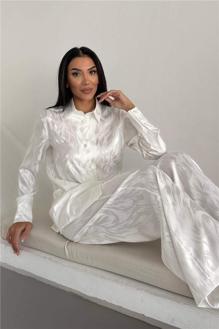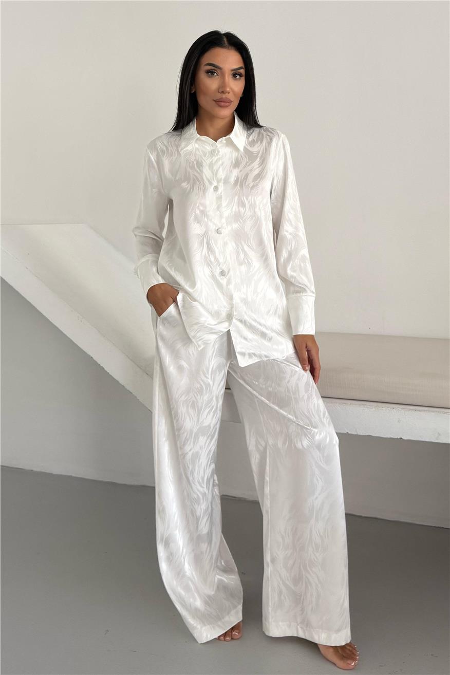 Елегантен сатенен комплект жакард от две части. Комплекта включва дълга риза с копчета и широк панталон с джобове. Този сатенен сет е идеален избор както за домашен уют, така и за стилен подарък. Материята е мека, нежна към кожата и придава усещане за лукс.