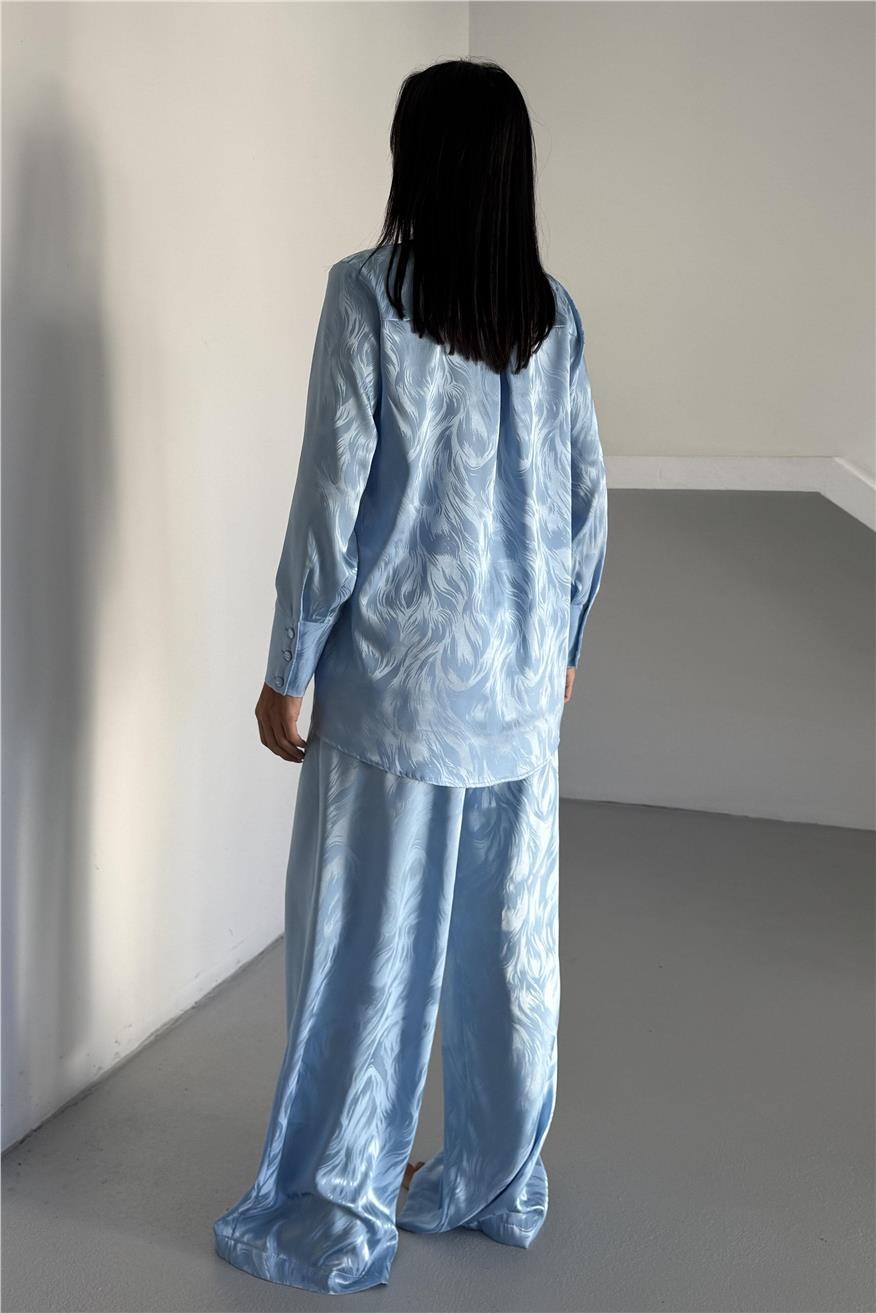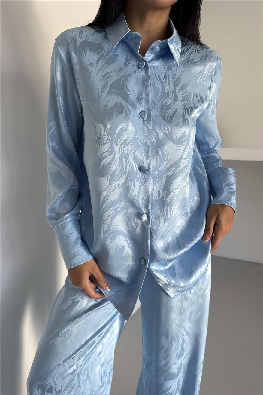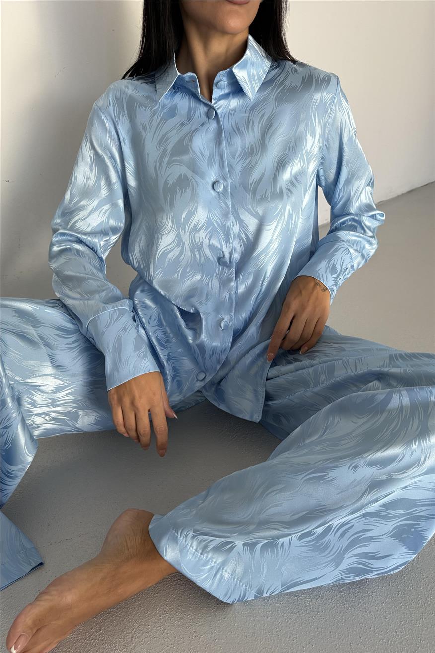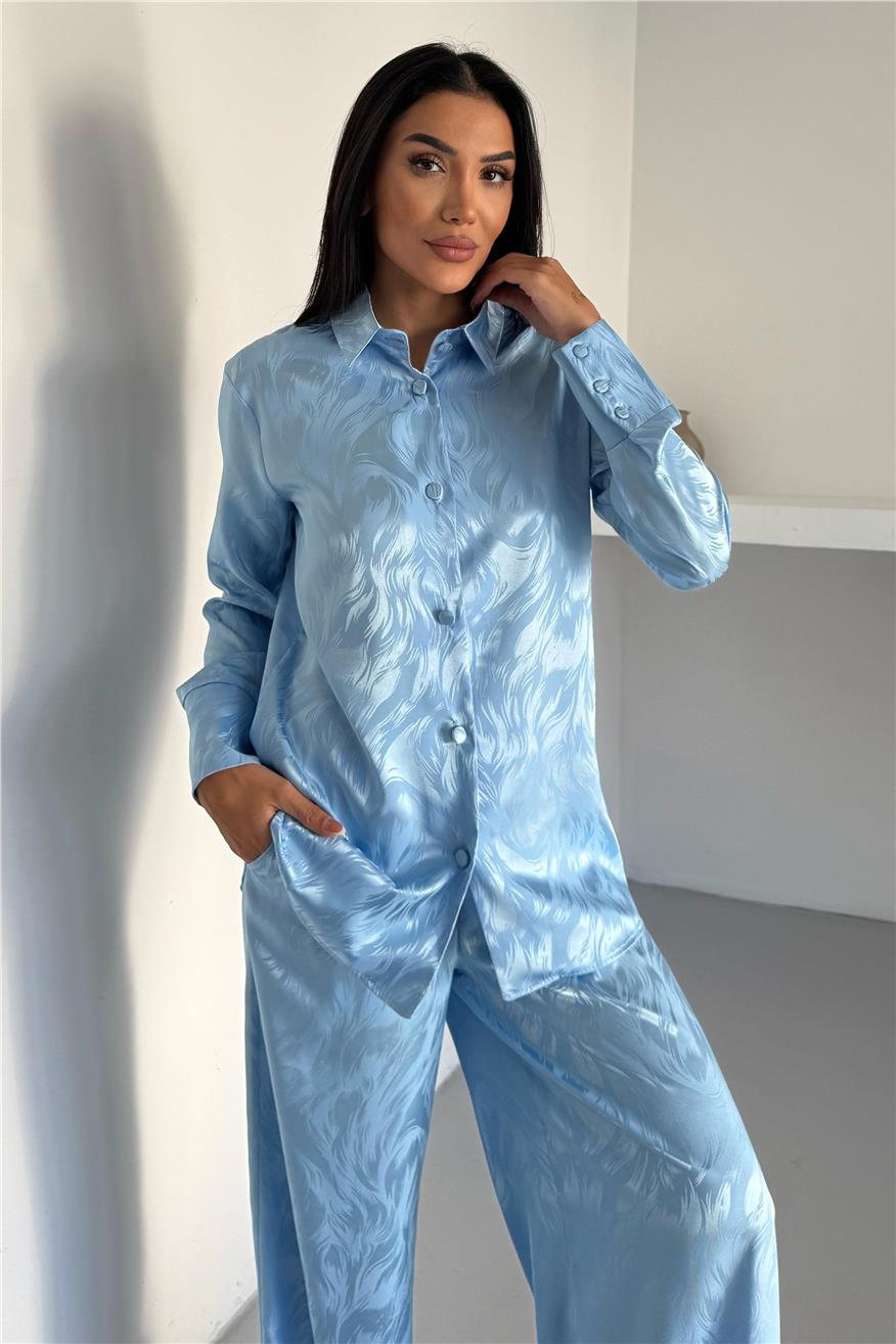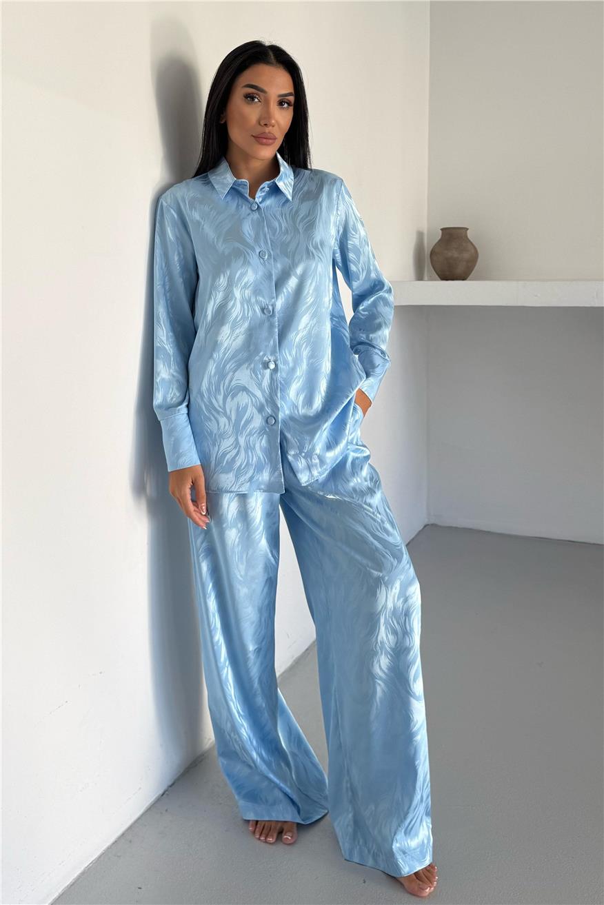 Елегантен сатенен комплект жакард от две части. Комплекта включва дълга риза с копчета и широк панталон с джобове. Този сатенен сет е идеален избор както за домашен уют, така и за стилен подарък. Материята е мека, нежна към кожата и придава усещане за лукс.