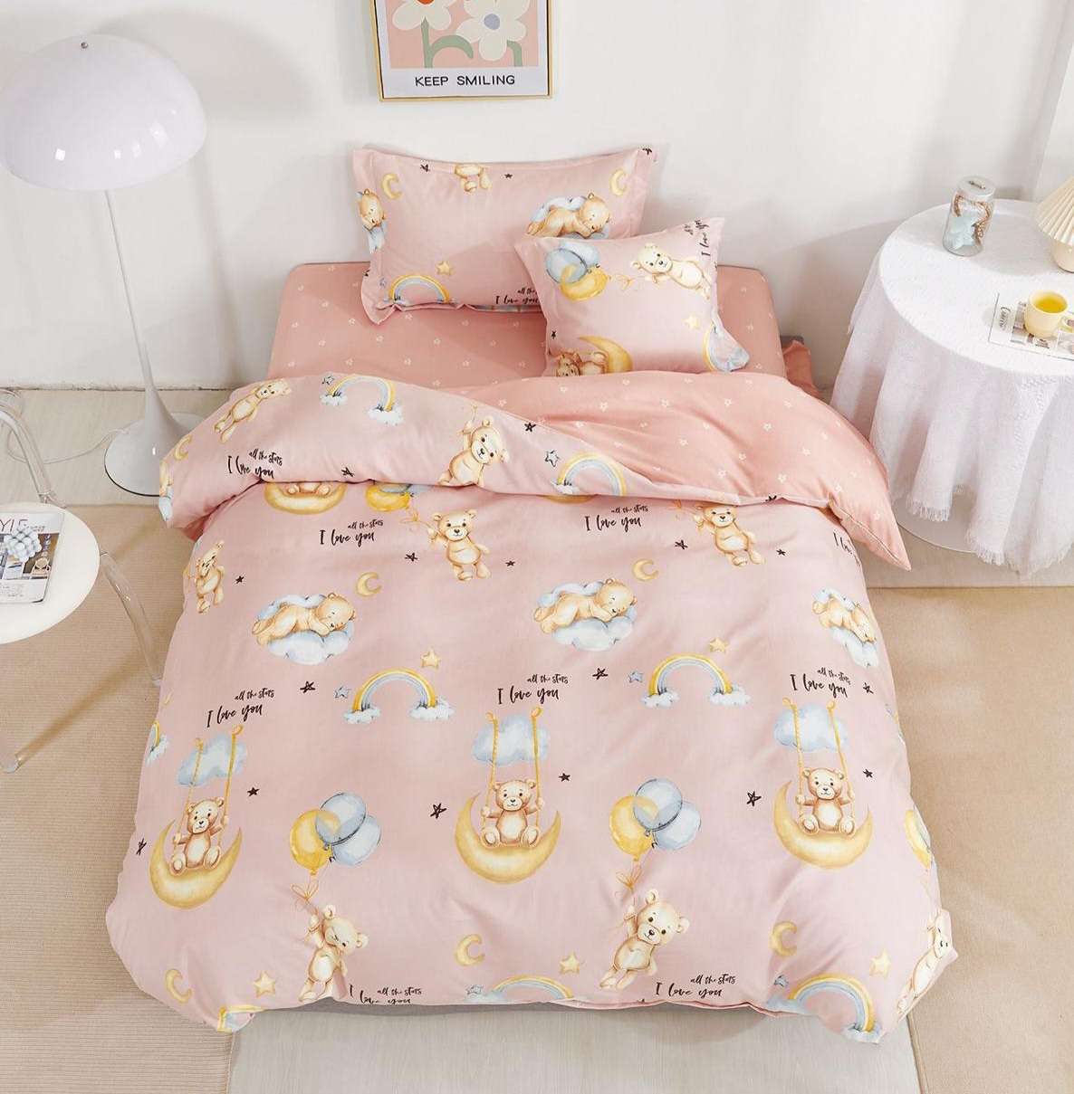 Цвят на чаршафа -бледо розов , пликът/двулицев/ и калъфките са-бледо розово на мечета