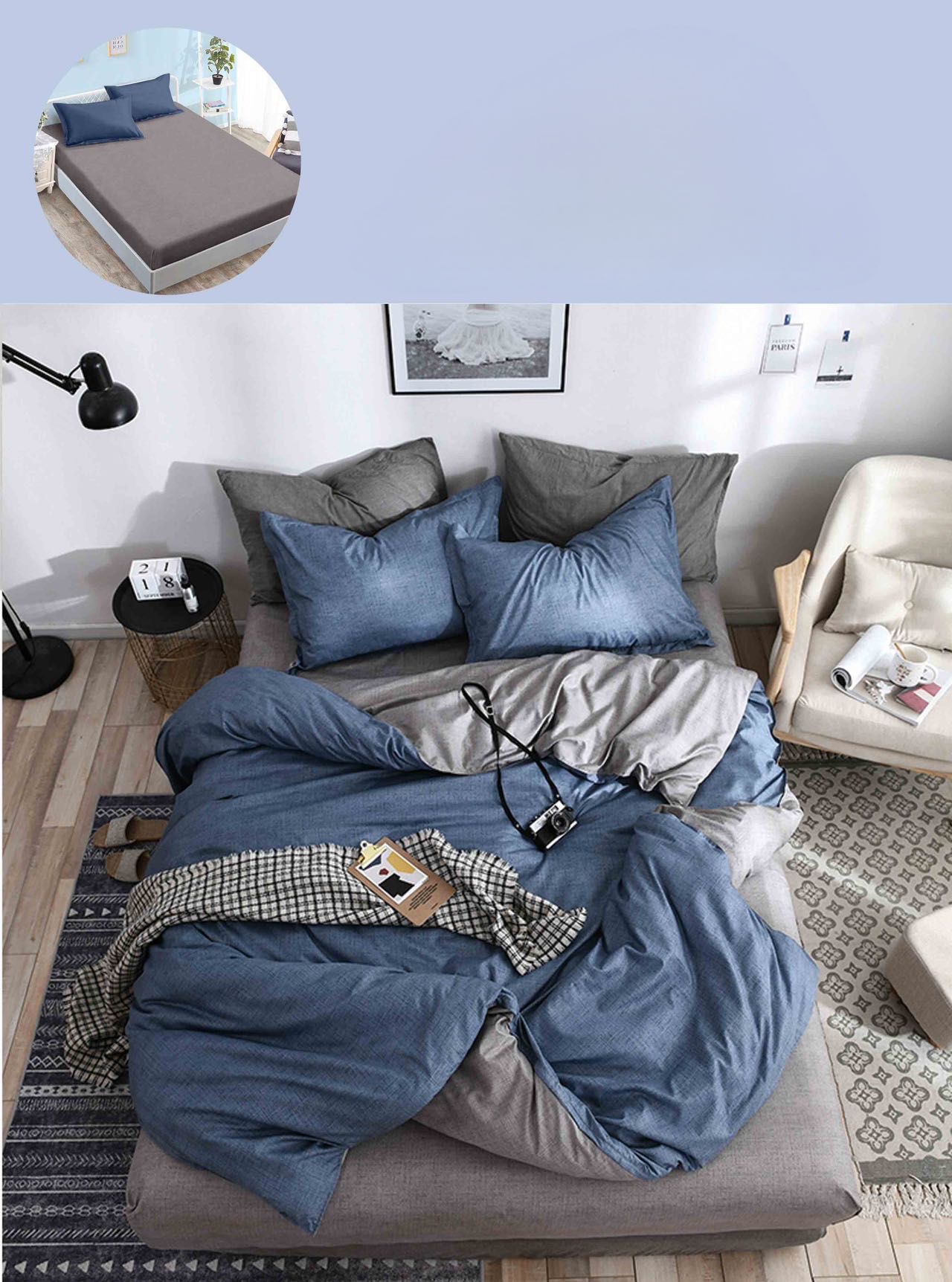 Цвят на чаршафа -тъмно сив , пликът/двулицев/ и калъфките са-СИН