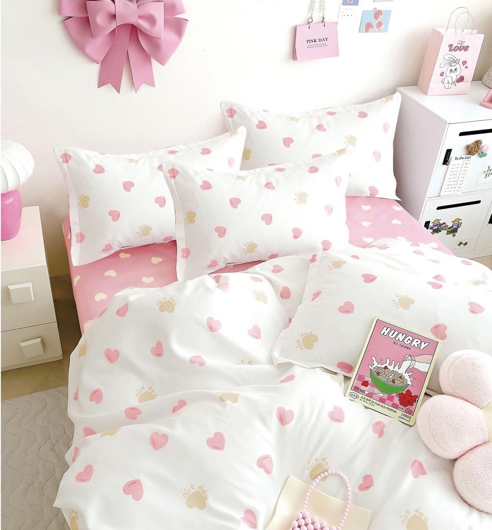 Цвят на чаршафа -розов на сърца , пликът/двулицев/ и калъфките са- бял на сърца