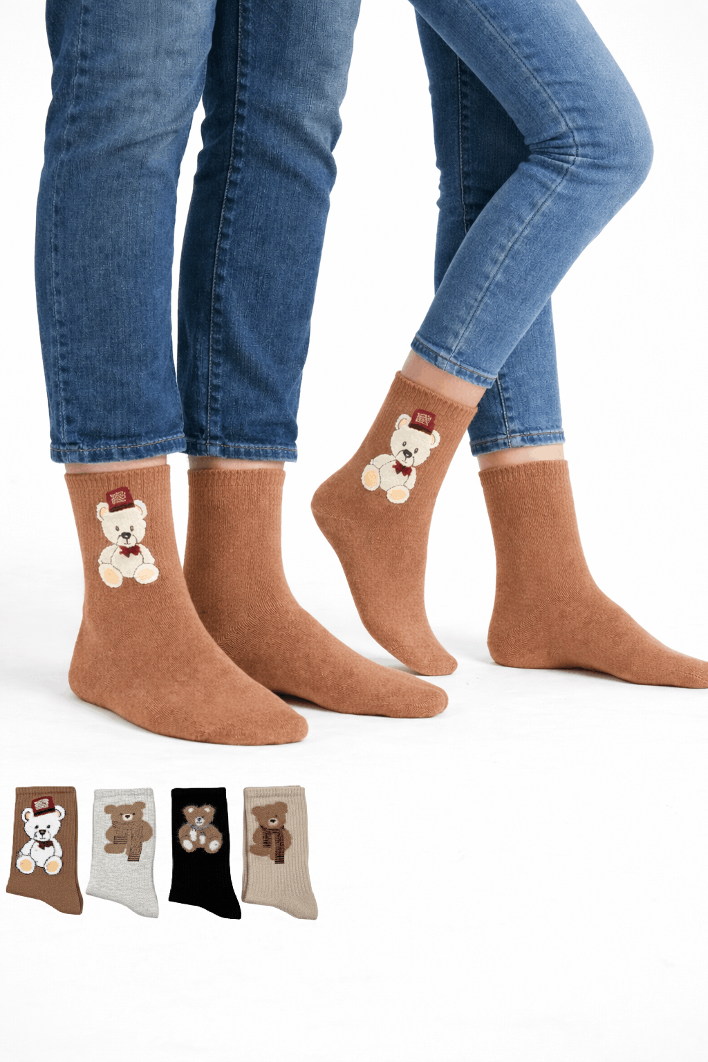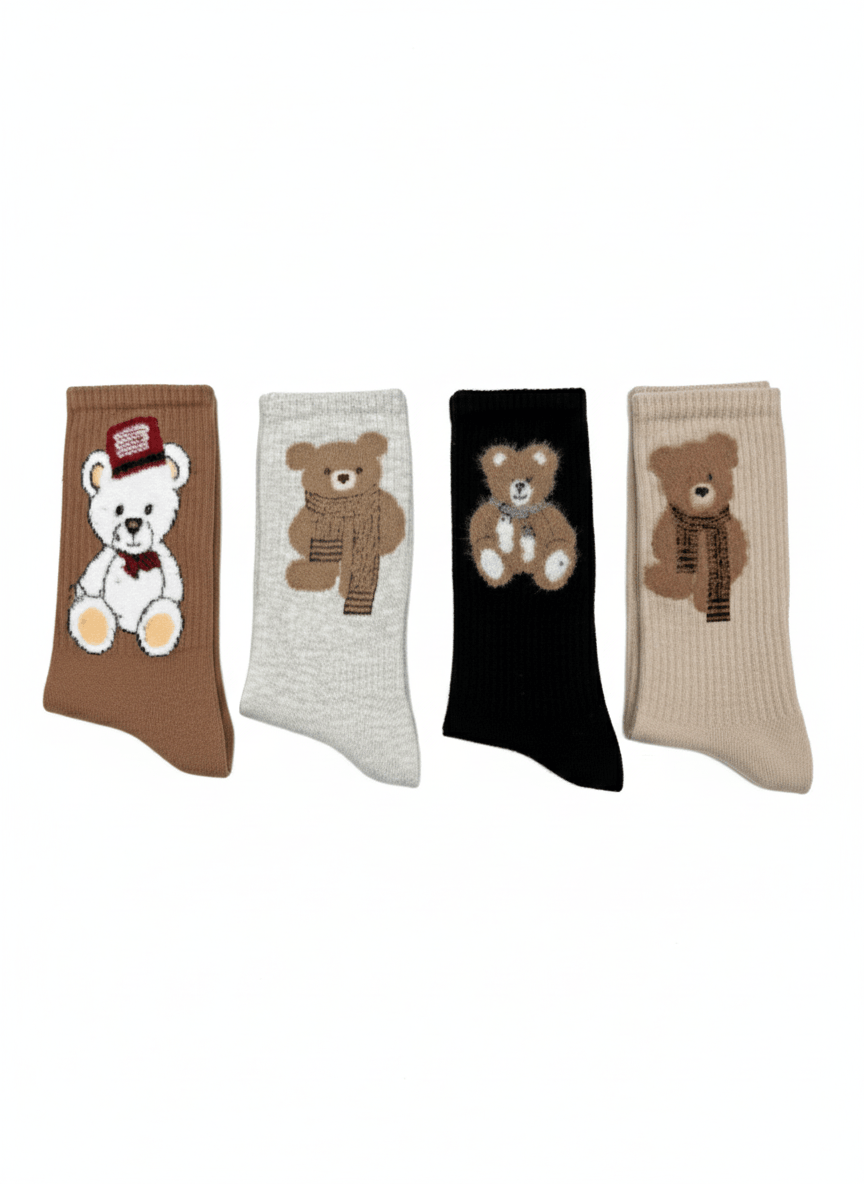 Комплектът включва 4 различни цвята, които лесно се съчетават с ежедневни и спортно-елегантни визии. Декоративният мотив с мече придава закачлив и модерен акцент, без да нарушава универсалния стил на чорапите.