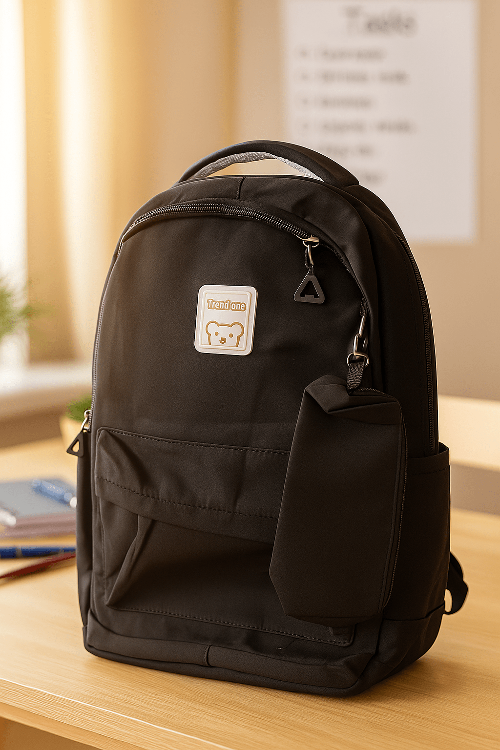 Стилна и практична раница с модерен дизайн, подходяща за училище, работа или пътуване. Раницата разполага с три удобни отделения с цип за лесна организация на учебници, лаптоп и аксесоари. В комплекта е включен и несесер, който допълва функционалността и улеснява съхранението на дребни вещи. Има и две странични джобчета подходящи за бутилки с вода.