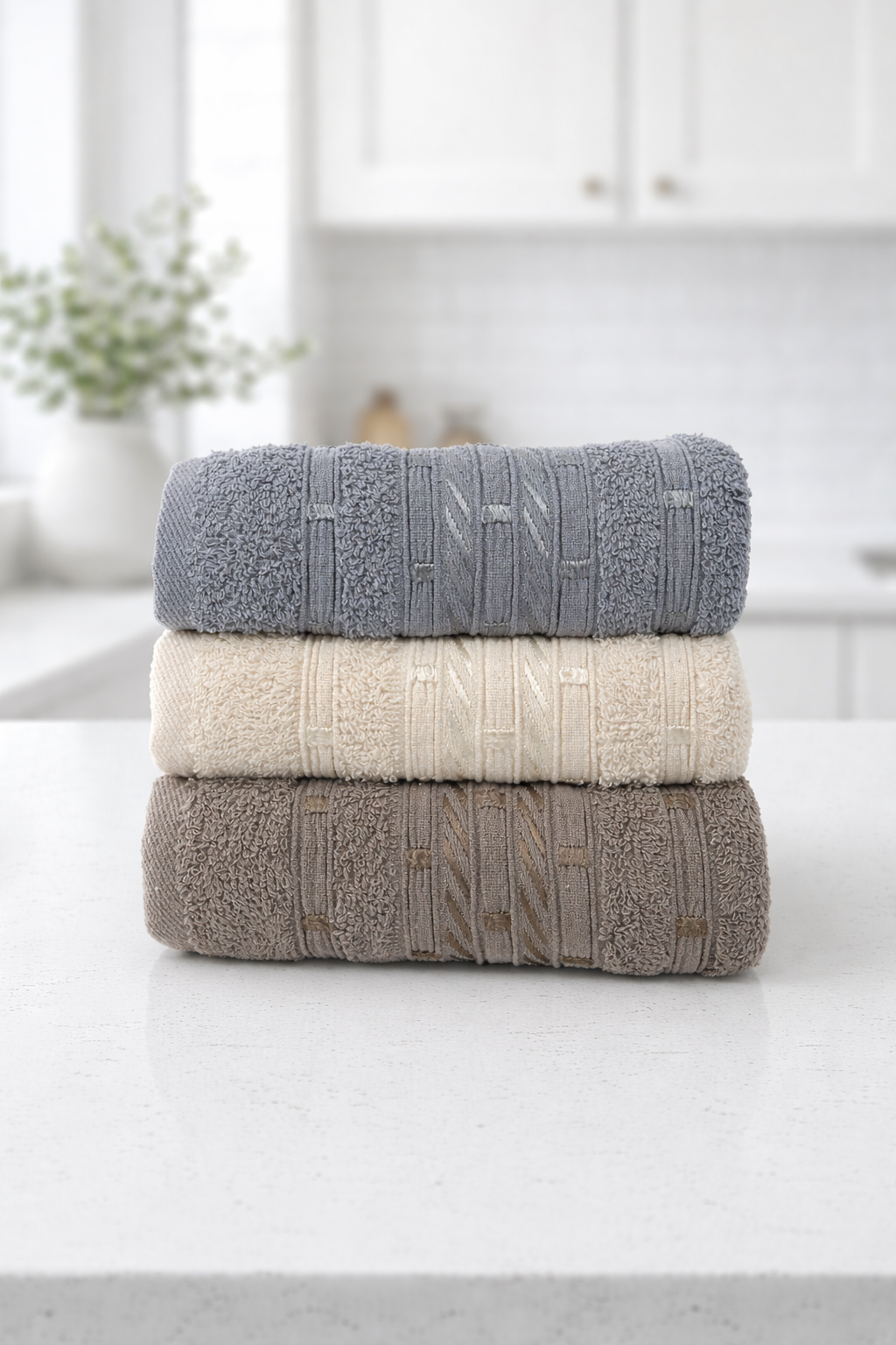 Хавлиени кърпи, 3 броя в. Изработена от 100 % памук . 350 гр./м3. Подходящ подарък за всеки ОПАКОВАНИ В ТЮЛЕНА ТОРБИЧНА празник.