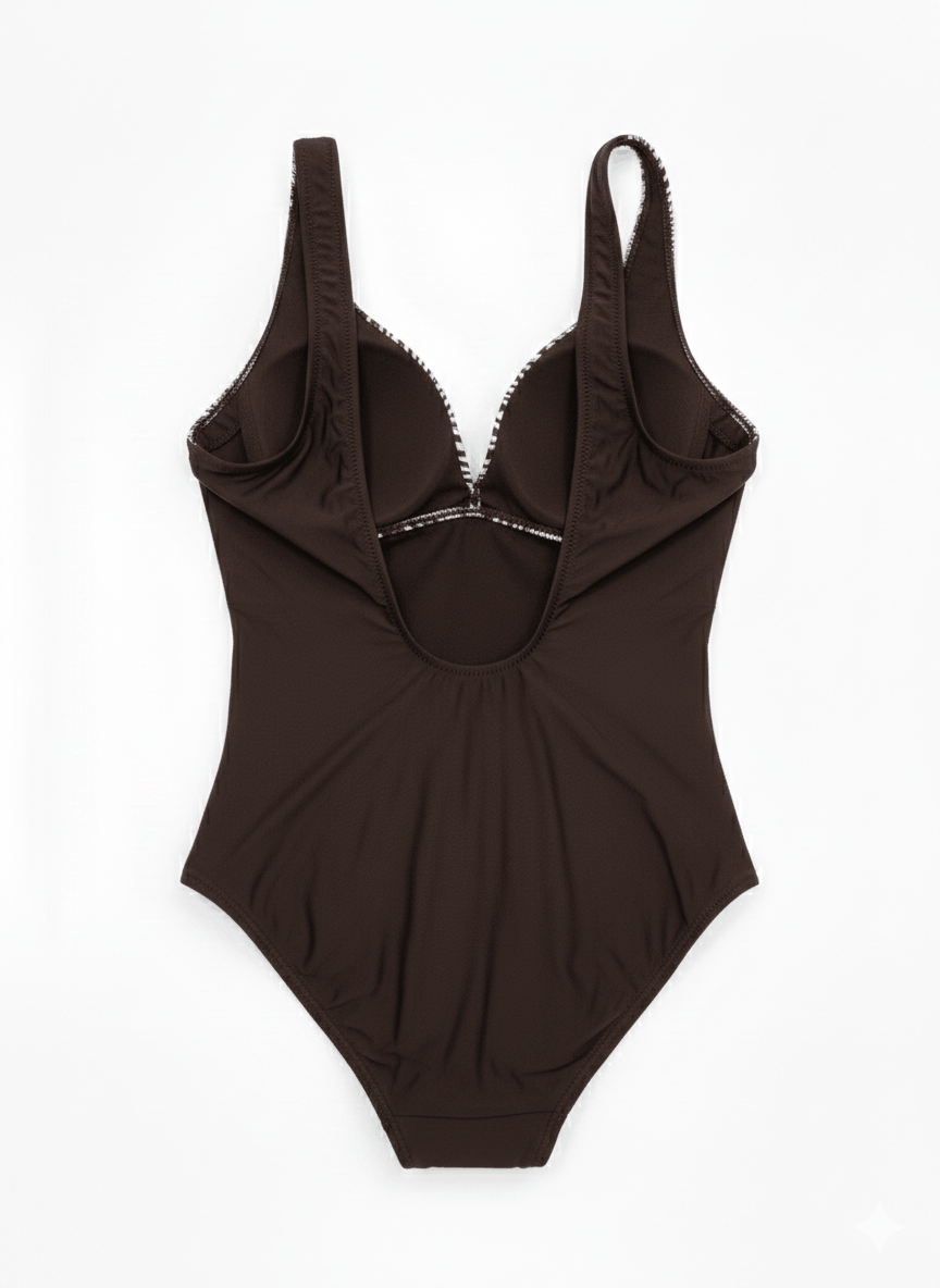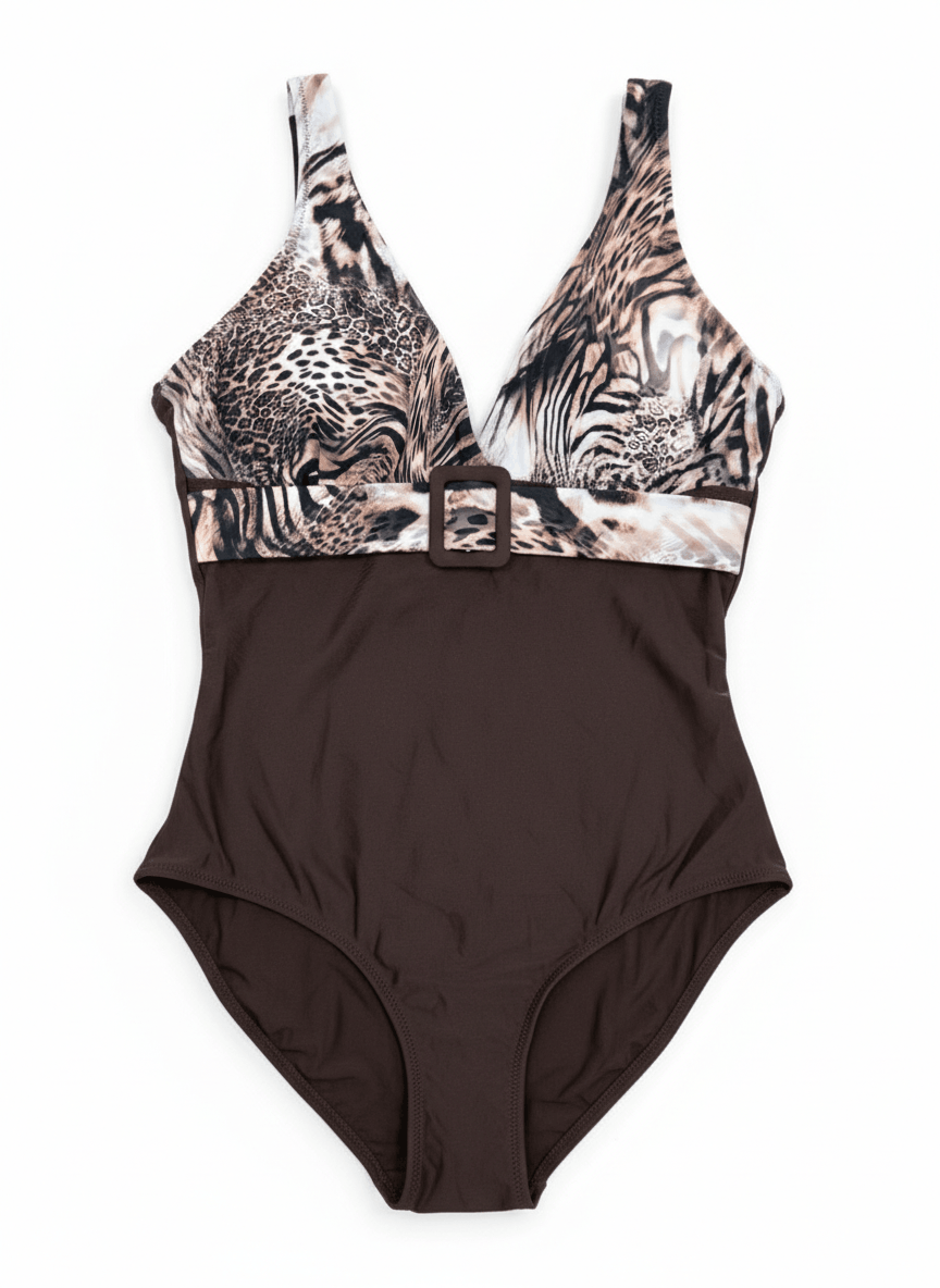 Елегантен дамски цял бански с модерен животински принт и стилна катарама в талията. Подходящ е както за плаж, така и за басейн.