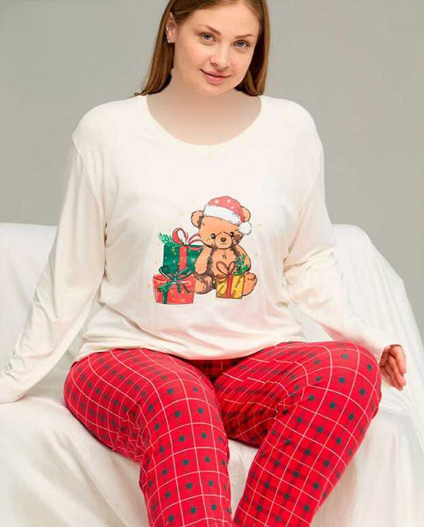 Дамска макси памучна пижама в екрю и червено с весел принт. Мека, удобна и дишаща материя за комфортен сън. Моделът може да се комбинира с детска пижама в същия десен – идеален избор за стилен семеен сет.
