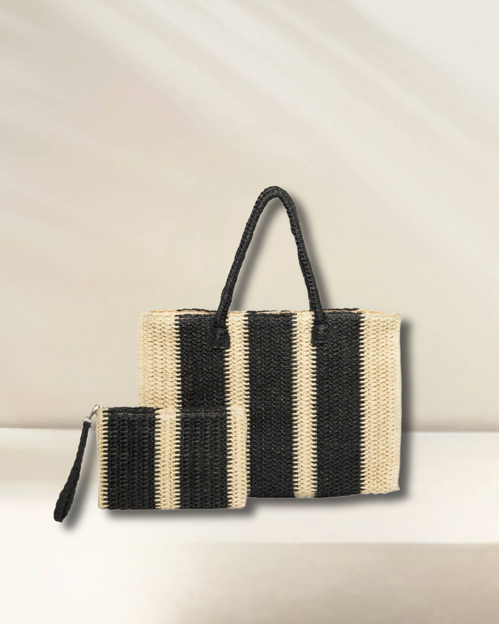 Бохо сламена плажна чанта в черно и бежово с несесер